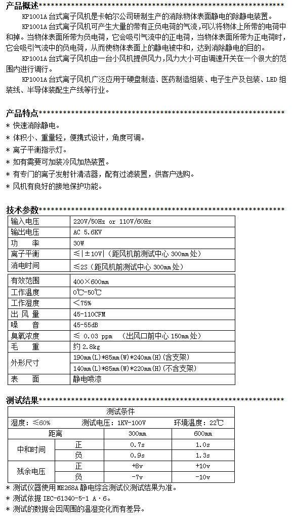 KP1001A第三代臺式離子風(fēng)機